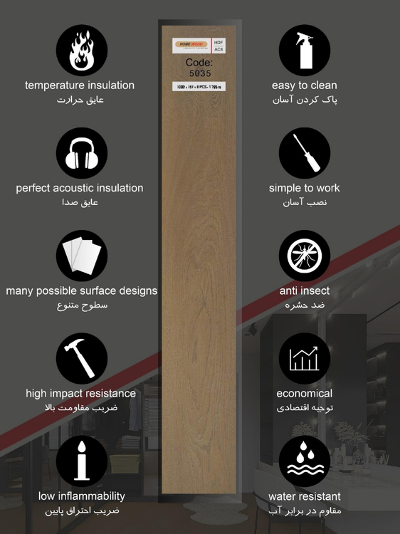 مشخصات فنی: جنس: تخته HDF با روکش وینیل ضدخش و مقاوم در برابر رطوبت