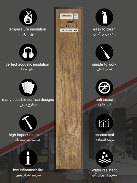 مشخصات فنی: جنس: تخته HDF با روکش وینیل ضدخش و مقاوم در برابر رطوبت
