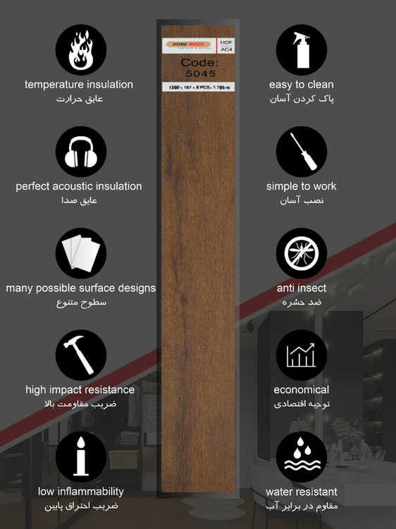 مشخصات فنی: جنس: تخته HDF با روکش وینیل ضدخش و مقاوم در برابر رطوبت