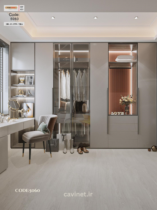 پارکت لمینت طرح چوب سفید طوسی، ضد خش برجسته، بسته بندی 8 عددی 1.8 متر مربع، AC4, H.D.F مدل 5060